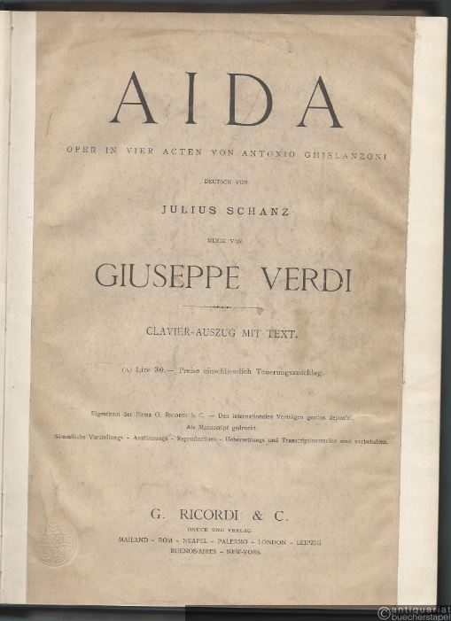 Aida. Oper in vier Acten von Antonio Ghislanzoni (= Edition Ricordi). Clavier-Auszug mit [deutschem] Text.