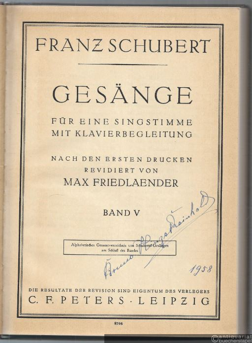Gesänge für eine Singstimme mit Klavierbegleitung, Band V (= Edition Peters, Nr. 792). Originalausgabe.