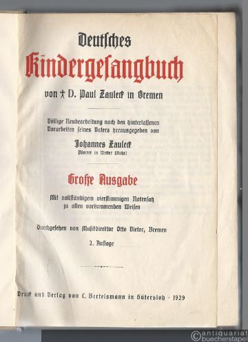 Deutsches Kindergesangbuch von Paul Zauleck in Bremen. Große Ausgabe. Mit vollständigem vierstimmigem Notensatz zu allen vorkommenden Weisen.