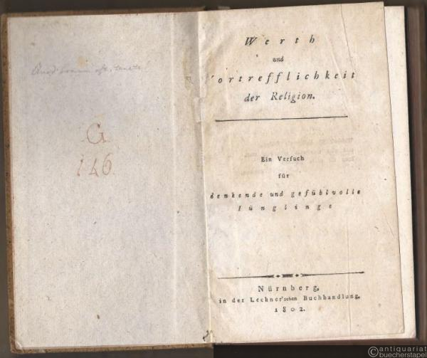 - Werth und Vortrefflichkeit der Religion. Ein Versuch für denkende und gefühlvolle Jünglinge.