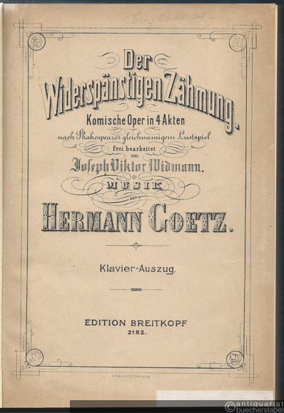 Der widerspänstigen Zähmung. Komische Oper in 4 Akten. Nach Shakespeare's gleichnamigem Lustspiel (= Edition Breitkopf, Nr. 2182). Klavier-Auszug.