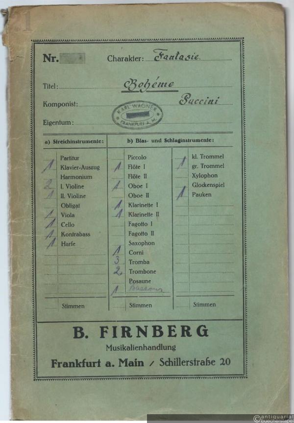 Fantaisie sur l'opera-comique La Boheme de G. Puccini. Pour Orchestre par Ad. Gauwin. Salonorchester. 21 Stimmen.