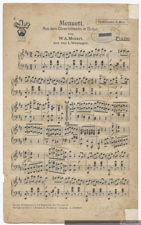 Menuett aus dem Divertimento in D-Dur [KV 334] (= Lyra No. 3148). Salonorchester. 12 Stimmen.