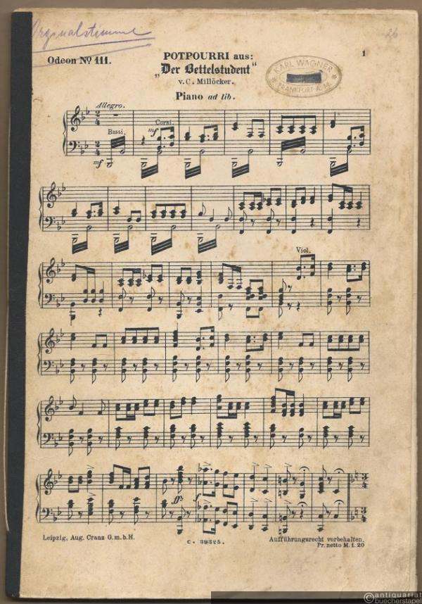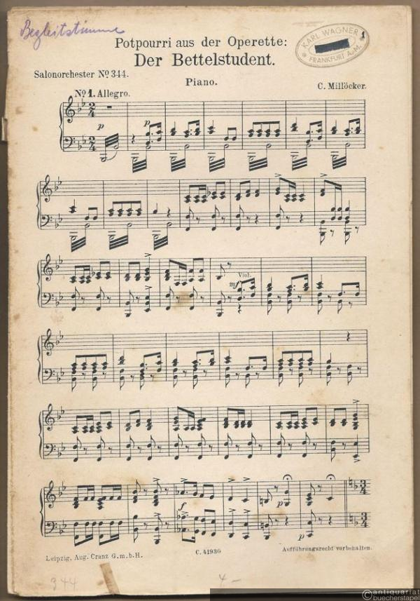Potpourri aus der Operette "Der Bettelstudent" v. C. Millöcker (= Odeon No. 111 u. Salonorchester No. 344). 14 Stimmen.