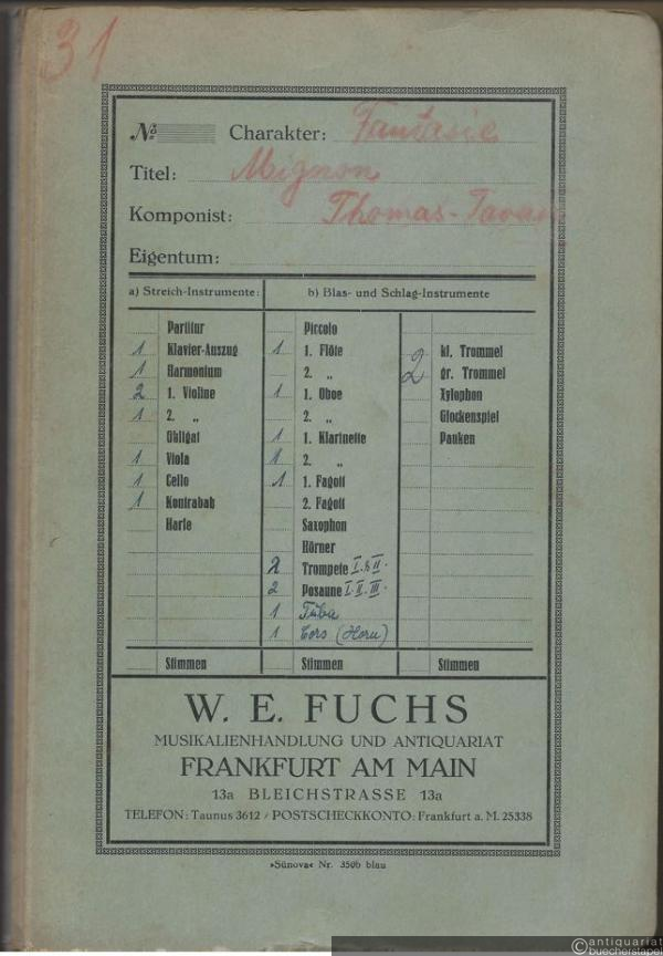 Fantaisie (Mignon, Opera d'Ambroise Thomas) (= L'opera symphonique. Fantaisies-mosaiques pouvant s'adapter a tous les orchestres sur les operas, ballets et operettes en vogue, 1). Salonorchester. 21 Stimmen.