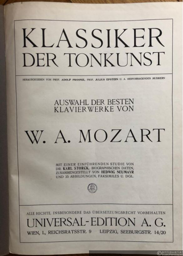 Auswahl der besten Klavierwerke von W. A. Mozart (= Klassiker der Tonkunst, hrsg. v. Adolf Prosnitz, Julius Epstein u. a.).