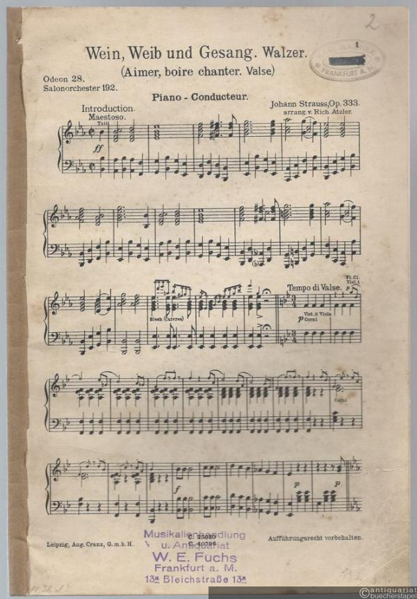 Wein, Weib und Gesang, Op. 333. Walzer / Aimer, boire chanter. Valse (= Odeon No. 28. Salonorchester No. 192). 12 Stimmen.