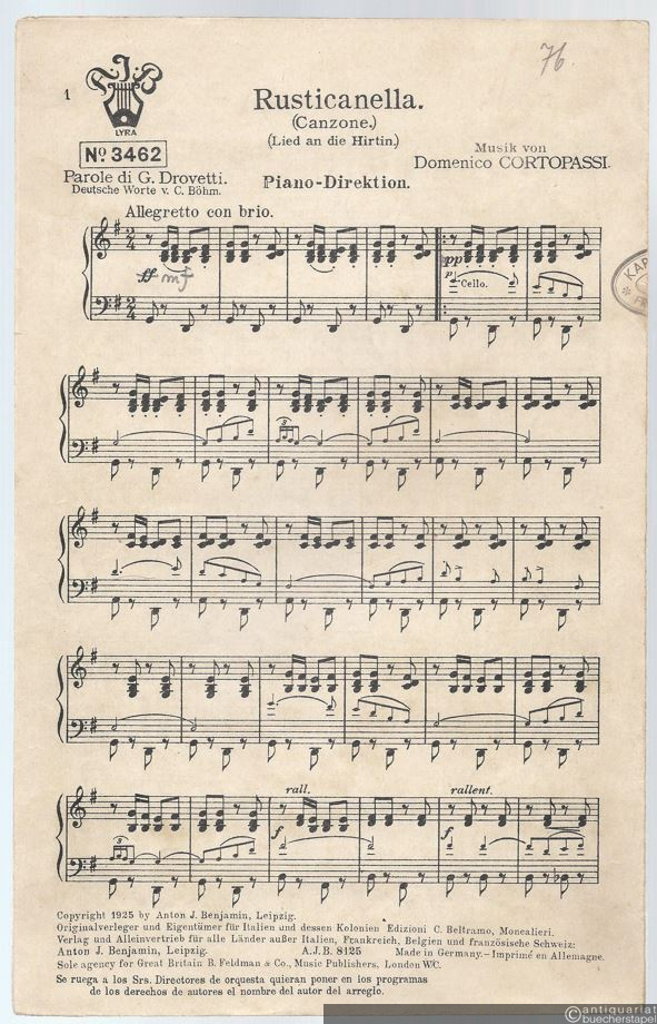 Rusticanella. Canzone. Lied an die Hirtin (= Lyra, No. 3462). Salonorchester. 12 Stimmen.