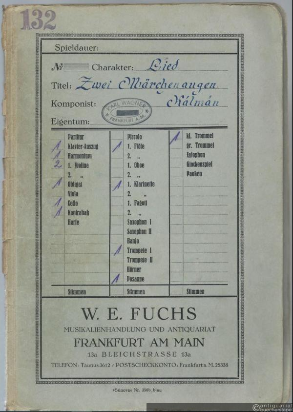 Zwei Märchenaugen. Musikalische Szene aus der Operette: Die Zirkusprinzessin. Salonorchester. 12 Stimmen.