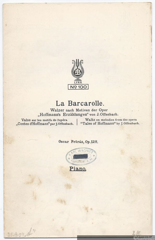 La Barcarolle, Op. 128. Walzer nach Motiven der Oper: Hoffmann's Erzählungen von J. Offenbach (= Lyra No. 100). Salonorchester. 13 Stimmen.