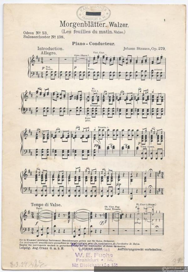 Morgenblätter, Op. 279. Walzer / Les feuilles du matin. Valse (= Odeon No. 53. Salonorchester No. 138). 13 Stimmen.