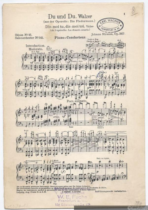 Du und du, Op. 367. Walzer aus der Operette: Die Fledermaus / Dis-moi tu, dis-moi toi. Valse de l'operette: La chauve-souris (= Odeon No. 16. Salonorchester No. 141). 12 Stimmen.