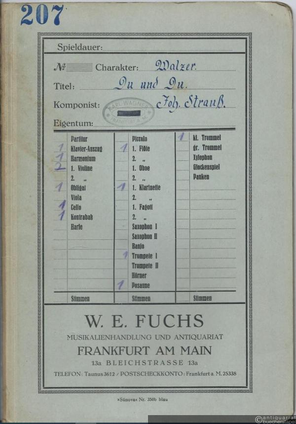 Du und du, Op. 367. Walzer aus der Operette: Die Fledermaus / Dis-moi tu, dis-moi toi. Valse de l'operette: La chauve-souris (= Odeon No. 16. Salonorchester No. 141). 12 Stimmen.