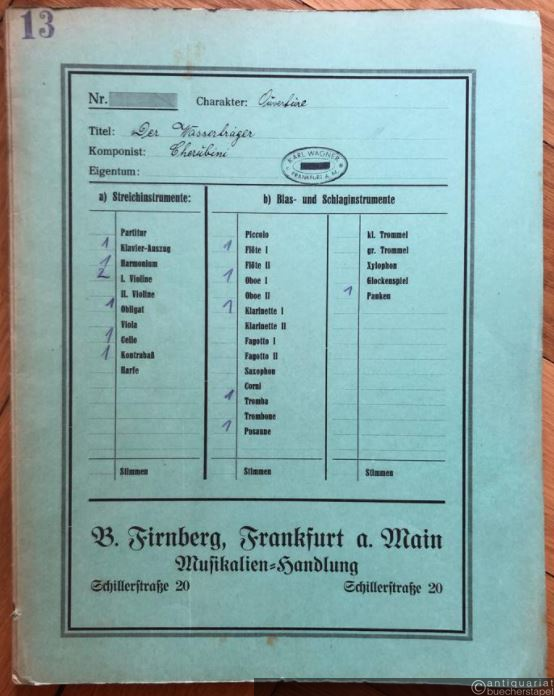 Ouverture zur Oper: Der Wasserträger / Ouverture of the opera: The Water Carrier / Ouverture de l'opera: Le porteur d'eau (= Lyra No. 2937). Salonorchester. 13 Stimmen.