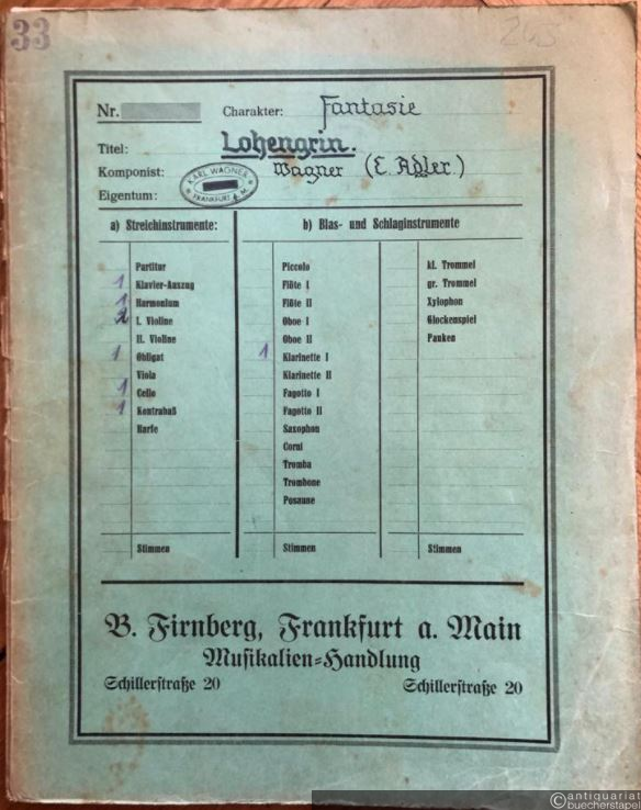 Lohengrin. Opera de Richard Wagner. Trio par Ernest Alder [= Trios sur les opéras du répertoire moderne, poèmes symphoniques, etc.]. Salonorchester. Klavierpartitur und 7 Stimmen.