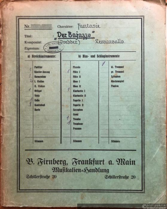Fantasie aus: Der Bajazzo - Pagliacci von R. Leoncavallo (= Fürstner's Salon-Orchester. Auswahl beliebter Kompositionen). Salonorchester. 13 Stimmen.