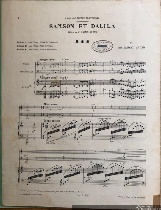 Samson et Dalila. Opera de C. Saint-Saens. Trio par Ernest Alder [= Trios sur les opéras du répertoire moderne, poèmes symphoniques, etc.]. Salonorchester. Klavierpartitur und 7 Stimmen.