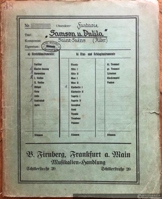 Samson et Dalila. Opera de C. Saint-Saens. Trio par Ernest Alder [= Trios sur les opéras du répertoire moderne, poèmes symphoniques, etc.]. Salonorchester. Klavierpartitur und 7 Stimmen.