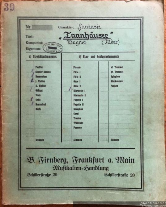 Tannhäuser. Opera de Richard Wagner. Trio par Ernest Alder [= Trios sur les opéras du répertoire moderne, poèmes symphoniques, etc.]. Salonorchester. Klavierpartitur und 7 Stimmen.