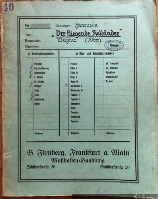 Le vaisseau fantome [Der fliegende Holländer]. Opera de Richard Wagner. Trio par Ernest Alder [= Trios sur les opéras du répertoire moderne, poèmes symphoniques, etc.]. Salonorchester. Klavierpartitur und 7 Stimmen.