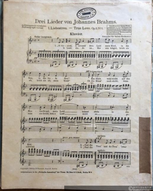Drei Lieder von Johannes Brahms: 1. Liebestreu, Op. 3 No. 1 / 2. Wiegenlied, Op. 49 No. 4 / 3. Feldeinsamkeit, Op. 86 No. 2. Ausgabe für Salonorchester. 11 Stimmen.