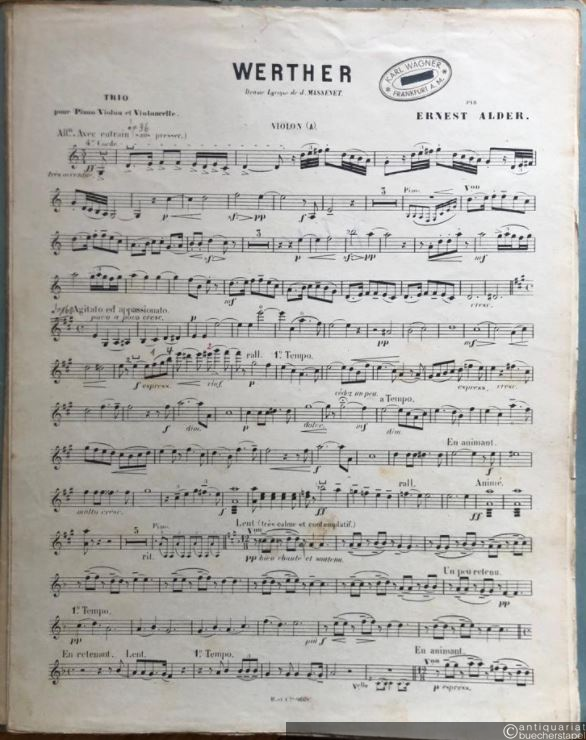 Werther. Drame lyrique de J. Massenet. Trio par Ernest Alder (= L'opera concertant. Trios sur les operas et ballets en vogue. Premiere serie, No. 5). Salonorchester. Klavierpartitur und 5 Stimmen.