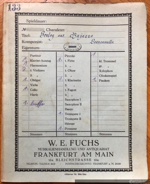 Der Bajazzo. Pagliacci. Drama in zwei Akten und einem Prolog. Prolog (= Fürstner's Salon-Orchester. Auswahl beliebter Kompositionen, No. 88). Salonorchester. 13 Stimmen.