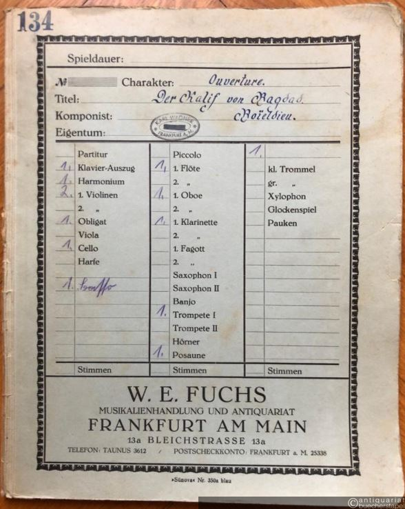 Ouverture zur Oper: Der Calif von Bagdad / Le Calife de Bagdad / The Calif of Bagdad (= Lyra No. 2617). Salonorchester. 13 Stimmen.