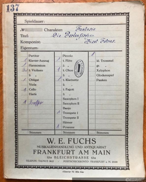 Die Perlenfischer. Fantasie über Motive aus George Bizet's gleichnamiger Oper (= Lyra No. 2833). Salonorchester. 13 Stimmen.