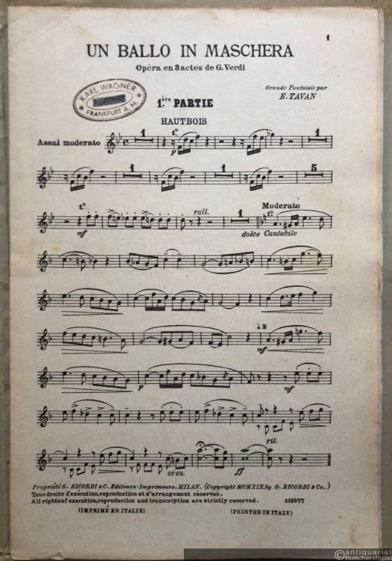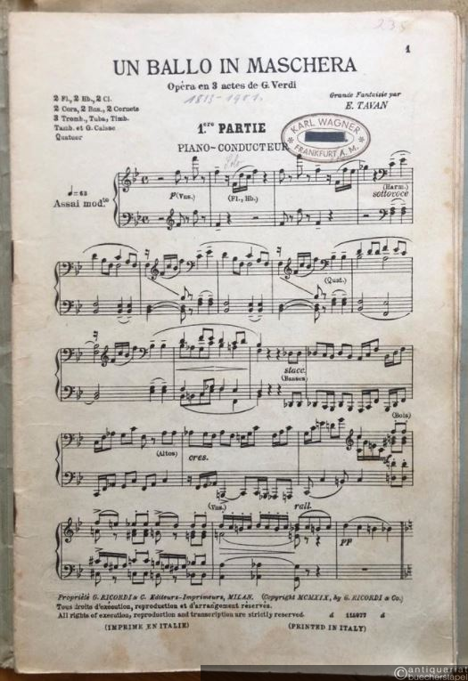 Un ballo in maschera. Opera en 3 actes de G. Verdi. Grande Fantaisie par E. Tavan. [Salon-]Orchester. 20 Stimmen.