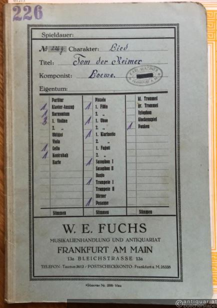 Tom der Reimer, Op. 135: "Der Reimer Thomas lag am Bach". Altschottische Ballade (= Edition Schott 01213 (pf) / Phönix Nr. 20). Salonorchester. 14 Stimmen.
