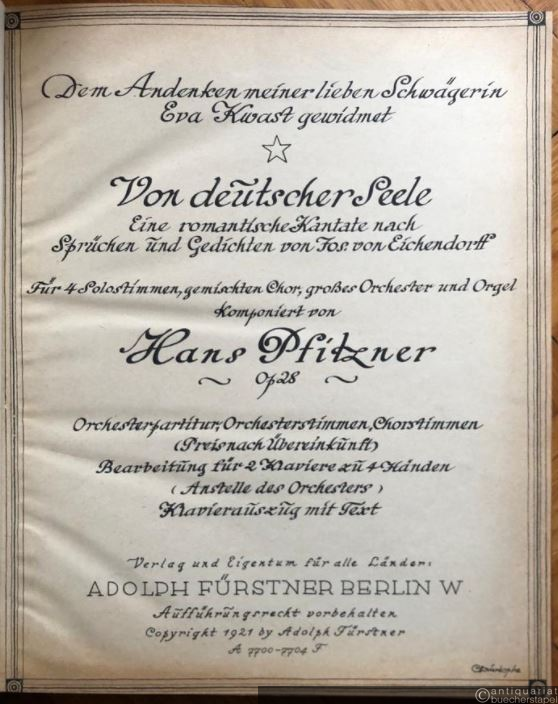 Von deutscher Seele, Op. 28. Eine romantische Kantate nach Sprüchen und Gedichten von Jos. von Eichendorff. Für 4 Solostimmen, gemischten Chor, großes Orchester und Orgel. Klavierauszug mit Text.