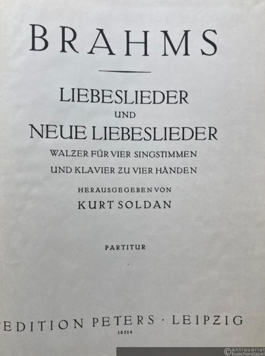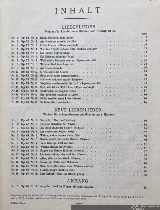 Liebeslieder und neue Liebeslieder. Walzer für vier Singstimmen und Klavier zu vier Händen [Op. 52, Nr. 1-18. Op. 65, Nr. 1-15. Anhang: Op. 65, Nr. 3 in tiefer Ausgabe] (= Edition Peters, Nr. 3912). Partitur.