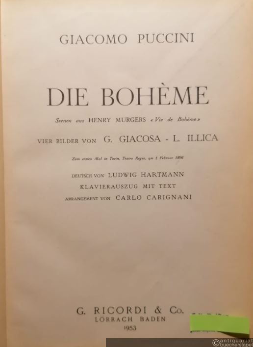 Die Boheme (Szenen aus Henry Murgers "Vie de Boheme". Vier Bilder von G. Giacosa - L. Illica. Klavierauszug mit Text.