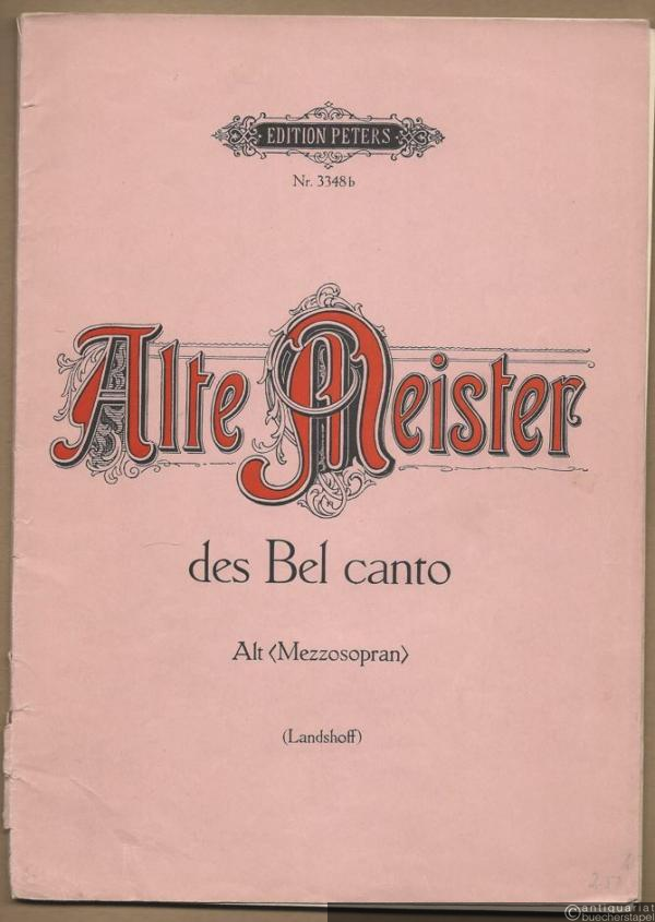 Für den praktischen Gebrauch herausgegeben von Ludwig Landshoff. VN/Pl. no. 9689 u. 9983. Gegenüberstellung des Originaltextes und der deutschen Übersetzung am Beginn jeder Nummer. Textunterlegung ital. Enthält 10 Nummern. Beiliegend eine Violoncellostimme zu den Nummern 5, 6, 9 u. 10. Mit Nachwort und Anmerkungen. Umschlag nachgedunkelt. Am unteren Rücken mit Läsuren. Gutes Expl.