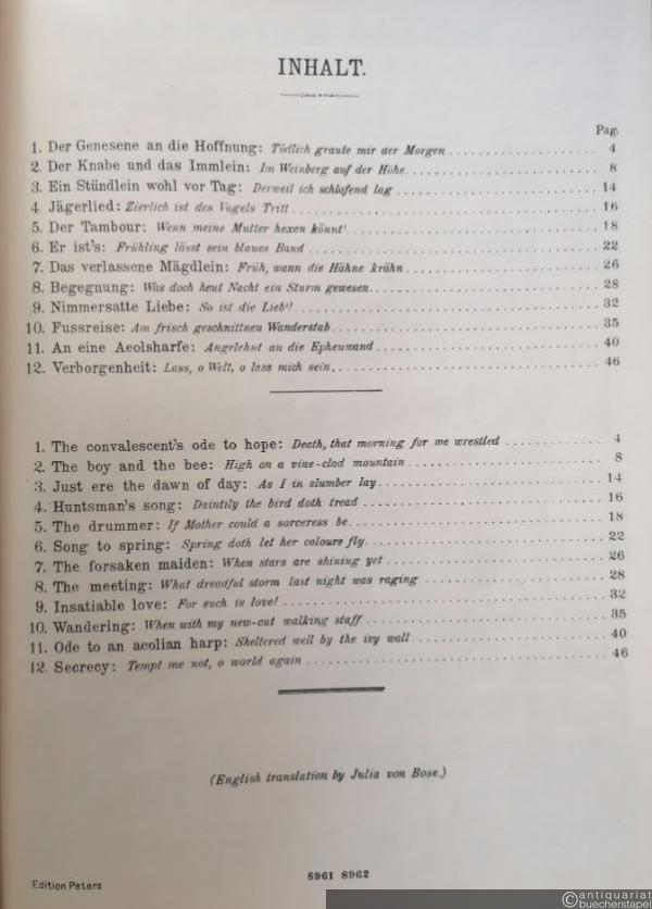 Gedichte von Eduard Mörike für eine Singstimme und Klavier, Band I (= Edition Peters, Nr. 3140b). Ausgabe für tiefere Stimme.