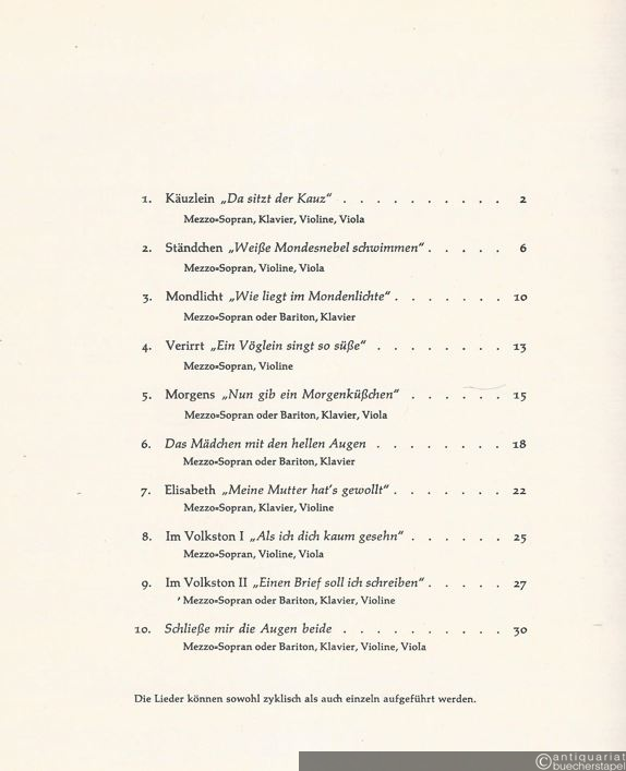 Zehn Lieder nach Worten von Theodor Storm für Mezzo-Sopran (auch Bariton), Klavier, Violine und Viola (in wechselnder Besetzung, Opus 32 (= Edition Schott, Nr. 4299).