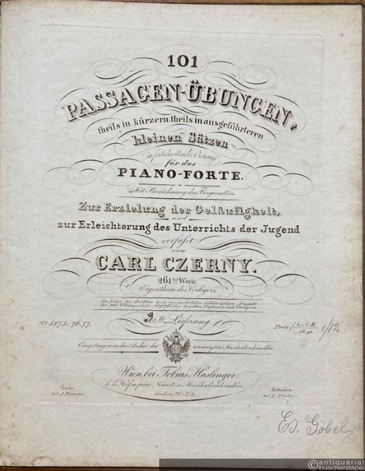101 Passagen-Übungen, theils in kürzern, theils in ausgeführteren kleinen Sätzen in fortschreitender Ordnung für das Piano-Forte. Mit Bezeichnung des Fingersatzes. Zur Erzielung der Geläufigkeit, zur Erleichterung des Unterrichts der Jugend verfasst von Carl Czerny. 261tes Werk. 3te Lieferung