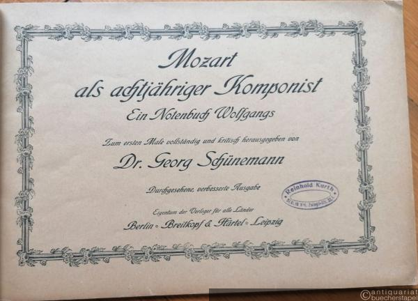 Zum ersten Male vollständig und kritisch hrsg. v. Georg Schünemann. VN/Pl. no. E.B. 3276. Mit Porträt des 7-jährigen Mozart als Frontispiz (A. W. Mozart Compositeur et Maitre de Musique age de 7 ans). Mit Einleitung des Herausgebers und Kritischen Bemerkungen am Schluss des Bandes. Mit Schutzumschlag. Papier gebräunt. Obere rechte Ecke gering bestoßen. Alter Stempel auf dem Titel. Sauber erhalten.