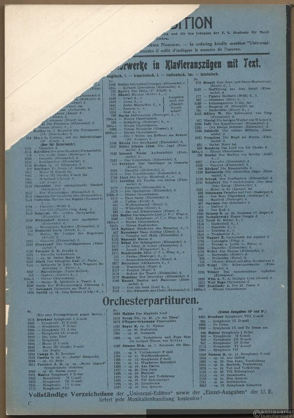 Die Opernprobe. Komische Oper in einem Akt. Text nach Joh. Friedrich Jünger frei bearbeitet (= Universal-Edition, No. 3197). Klavierauszug zu zwei Händen mit hinzugefügtem Gesangstext.