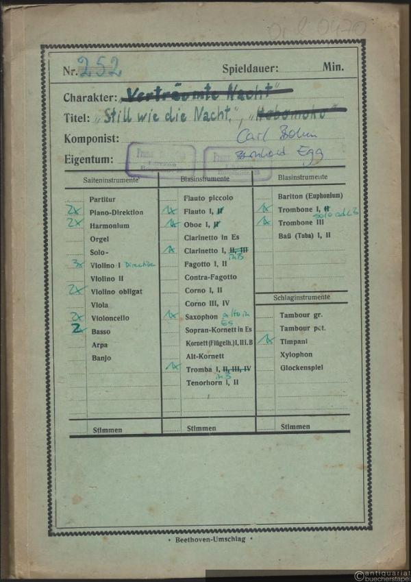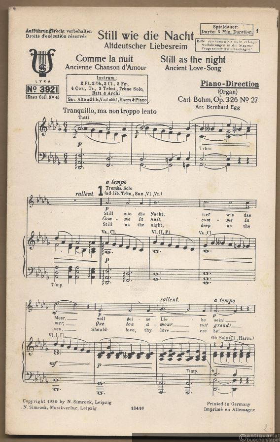 Still wie die Nacht. Altdeutscher Liebesreim, Op. 326 No. 27 / Comme la nuit / Still as the night (= Lyra No. 3921). Salonorchester. 21 Stimmen.