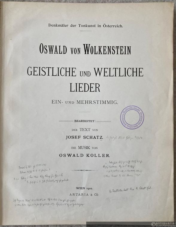 Oswald von Wolkenstein. Geistliche und weltliche Lieder. Ein- und mehrstimmig (= Denkmäler der Tonkunst in Österreich, u. Ltg. v. Guido Adler. Jahrg. IX, 1. Teil).
