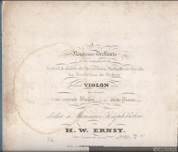 La Tentation de Halevy (= 3 Rondinos brillants sur des motifs favoris de Robert le diable de Meyerbeer, Nathalie de Caraffa, La Tentation de Halevy pour le Violon seul avec accomp.t d'un second Violon (ad lib.) ou de Piano (ad lib.) dediee a Monsieur Joseph Böhm par H. W. Ernst, Op. 5 No. 3).