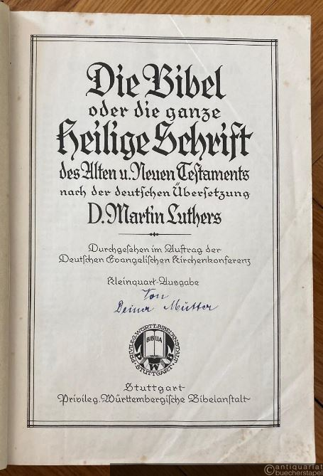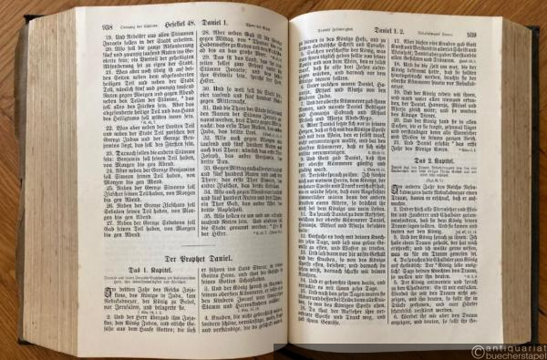 Fraktur. Beigebunden: Die Apokryphen. Das sind Bücher, so der heiligen Schrift nicht gleich gehalten, und doch nützlich und gut zu lesen sind. Nach der deutschen Übersetzung D. Martin Luthers. - Das Neue Testament unsers Herrn u. Heilandes Jesu Christi. Durchgesehen im Auftrag der Deutschen Evangelischen Kirchenkonferenz. Kleinquart-Ausgabe. - Ordnung der biblischen Bücher. - Anhang (Inhalt siehe Bild), mit Familienchronik (teils ausgefüllt mit Namen Süss / Hertel aus Eliasbrunn) und Karten. 1008, 130, 334, 77, [20] S. Deckel gelockert, Ecken und Kanten bestoßen, unteres Kapital lädiert. Vorsatzblatt lose. Einige Seiten an den Ecken etwas braunfleckig. Schnitt braunfleckig. Außen mit deutlichen Gebrauchsspuren, innen gut erhalten.