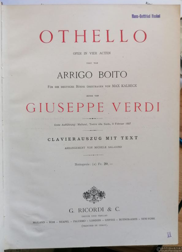 Othello. Oper in vier Acten. Clavierauszug mit Text.