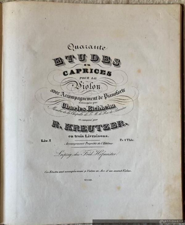 Quarante Etudes ou Caprices pour le Violon avec Accompagnement de Pianoforte arrangees par Charles Eichheim (Membre de la Chapelle de S. M. le Roi de Baviere) et compose par R. Kreutzer. En trois livraisons [hier Liv. I-III in einem Band (nur die Violine)]. - [Fehldruck: Nr. 1 fehlt].