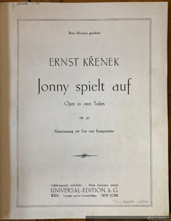 Jonny spielt auf (1925/26). Oper in zwei Teilen, op. 45 (= Universal-Edition, Nr. 8621). Klavierauszug mit Text vom Komponisten.