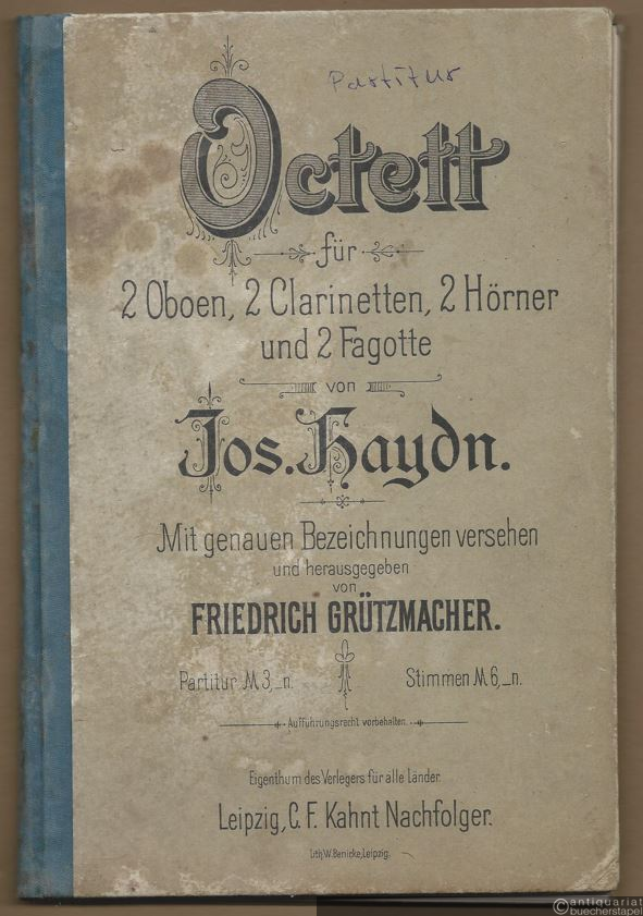 Octett [F-Dur] für 2 Oboen, 2 Clarinetten, 2 Hörner und 2 Fagotte von Jos. Haydn [Partitur].