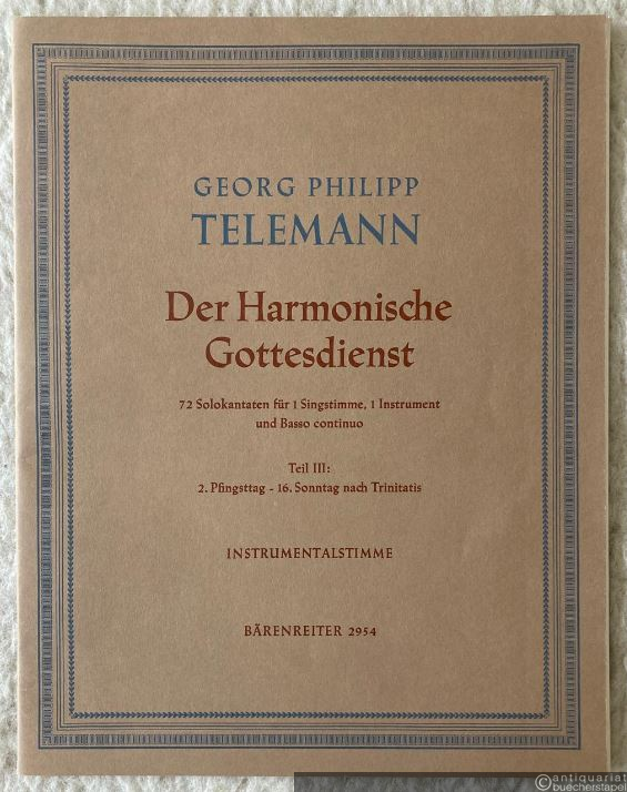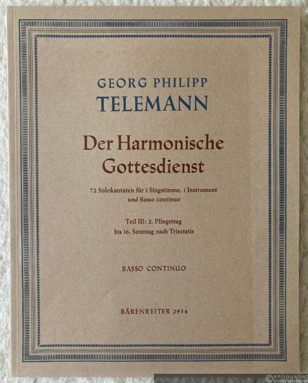 Der Harmonische Gottesdienst. Ein Jahrgang von 72 Solokantaten für 1 Singstimme, 1 Instrument und Basso continuo (Hamburg 1725/26), Teil III: 2. Pfingsttag bis 16. Sonntag nach Trinitatis (= Georg Philipp Telemann, Musikalische Werke, Band IV). BA 2954. Partitur, Instrumentalstimme u. Bc.
