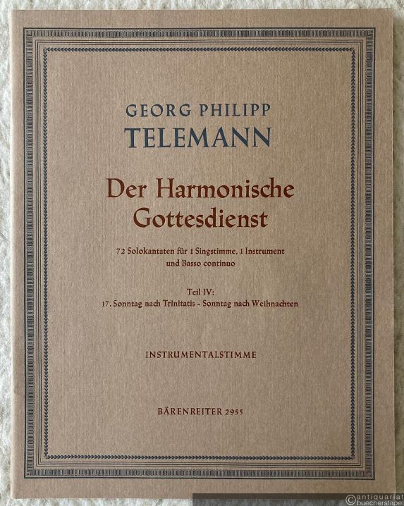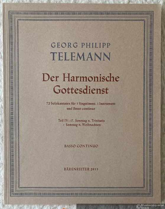 Der Harmonische Gottesdienst. Ein Jahrgang von 72 Solokantaten für 1 Singstimme, 1 Instrument und Basso continuo (Hamburg 1725/26), Teil IV: 17. Sonntag nach Trinitatis bis Sonntag nach Weihnachten (= Georg Philipp Telemann, Musikalische Werke, Band V). BA 2955. Partitur, Instrumentalstimme u. Bc.